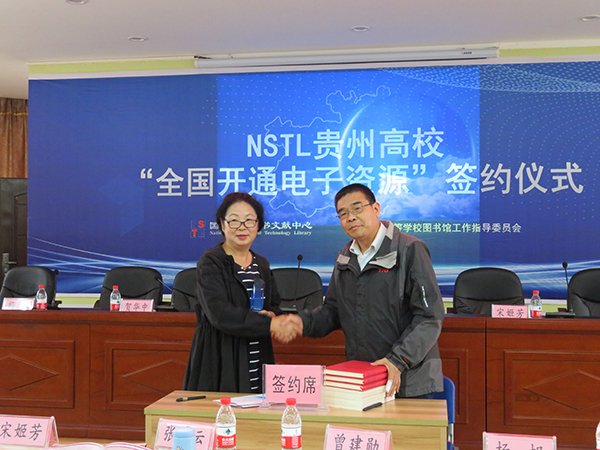 NSTL信息资源中心主任曾建勋和贵州省高校图工委秘书长张伟云进行“全国开通电子资源”签约仪式