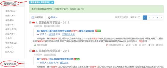 图4 左侧窗按国家地区、资助来源、资助年度、项目级别等前几位排序
