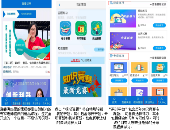 【首页】【直播讲座】【模拟答题】【实训平台】【个人中心】,以下是对应功能应用的图示操作流程。