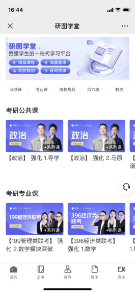 研图学堂学习平台是苏州研途教育科技有限公司依托自身多年教培经验和师资力量,倾力打造的专业服务于机构用户的全新线上学习平台。研图学堂学习平台目前由考研公共课、考研专业课、考研院校规划课程、英语四六级和教师资格证五个课程部分组成。用户可以通过PC端和移动端(微信)在线查阅使用视频课程,在线、下载使用题库、讲义资源并进行学习、阶段测评。