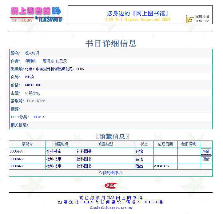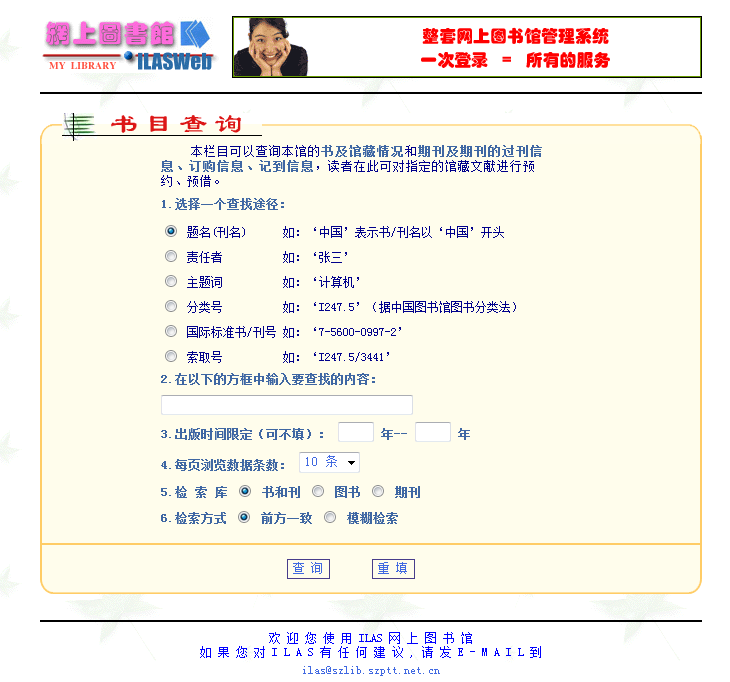 查目录:书目查询系统提供了六种检索途径:题名、责任者、主题词、分类号、国际标准书/刊号、索取号。