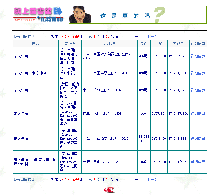 2、利用题名途径查询:选中题名,在输入框中输入老人与海,点击查询。如下图: