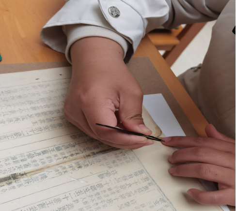 活动现场,图书馆古籍特藏部伍双林老师首先在“知识讲堂”环节为大家揭开了古籍修复的奥秘,系统讲解了古籍的结构、常见病害及“修旧如旧”的修复原则。随后的“核心体验”环节将活动推向高潮,在老师的悉心指导下,亲手为模拟残页“诊病疗伤”,通过溜口、补纸、压平等基础修复步骤,完成一次与历史面对面的匠心接力。在指尖与古纸的交汇中,建立与历史的情感连接,从而真正理解“保护古籍,就是守护我们共同的文化根脉”。