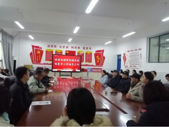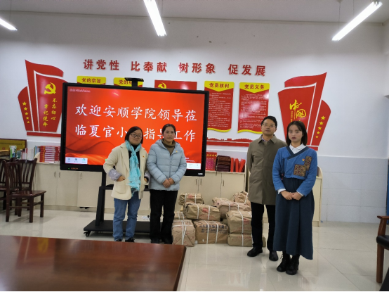 12月29日下午,郭本华副校长带队到安顺学院乡村振兴驻村片区小学夏官小学调研指导毕业实习工作、乡村振兴驻村工作并开展图书捐赠活动。安顺学院党委委员、组织部部长何朝越,图书馆馆长陈韶华、副馆长江涛、图书馆相关科室负责人及体育学院、外语学院实习指导相关老师,驻村工作队员等,参加了此次调研及图书捐赠活动。