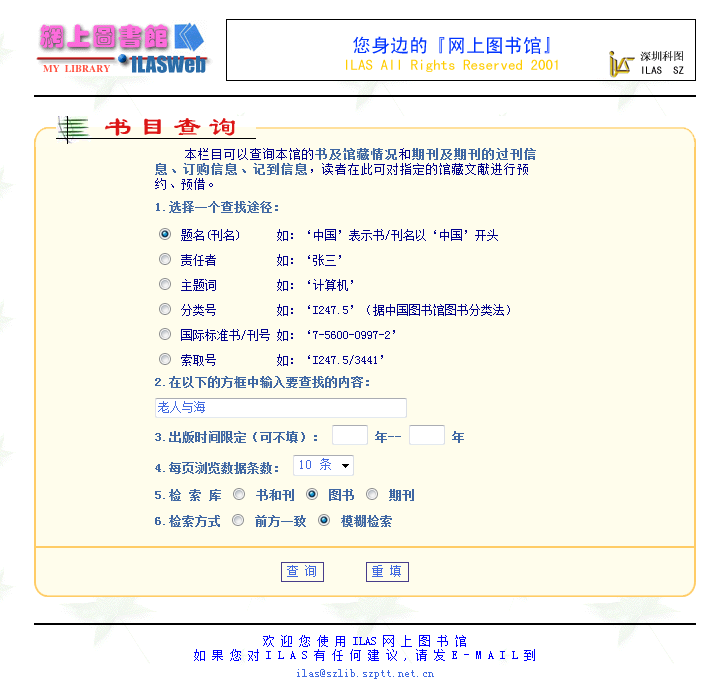 2、利用题名途径查询:选中题名,在输入框中输入老人与海,点击查询。如下图: