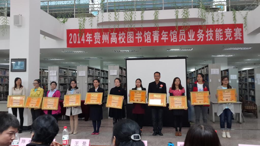 2014年10月15日,“2014年贵州省高校图书馆青年馆员论坛”活动在贵州财经大学图书馆举行。本次活动由贵州省高等学校图书馆工作指导委员会主办,贵州师范大学图书馆承办,贵州财经大学图书馆协办,活动主题为“青春飞扬@圕·青年馆员职业素养与服务水平提升”。活动分为四个版块:业务知识竞答;业务技能操作比赛;主题演讲、才艺表演;图书馆服务情景模拟剧表演。此次活动有贵州师范大学图书馆、贵州财经大学图书馆、遵义师范学院图书馆等17所高校图书馆组队参加,各队队员通过激烈的竞技,从多角度展现了各高校图书馆青年馆员的精神风貌、职业精神和业务素养。