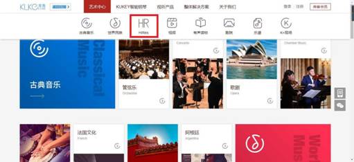 2)在库客音乐PC端页面,将鼠标置于“艺术中心”一栏,即可看到Hi-Res分类,图3。