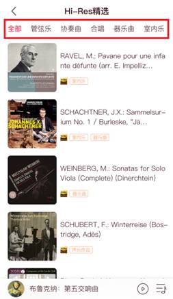 在Hi-Res高清音质页面点击更多可进入详细页面,该页面顶部显示Hi-Res分类,左右滑动可查看全部15个分类,点击任意分类可查看该类所包含的专辑,图4。